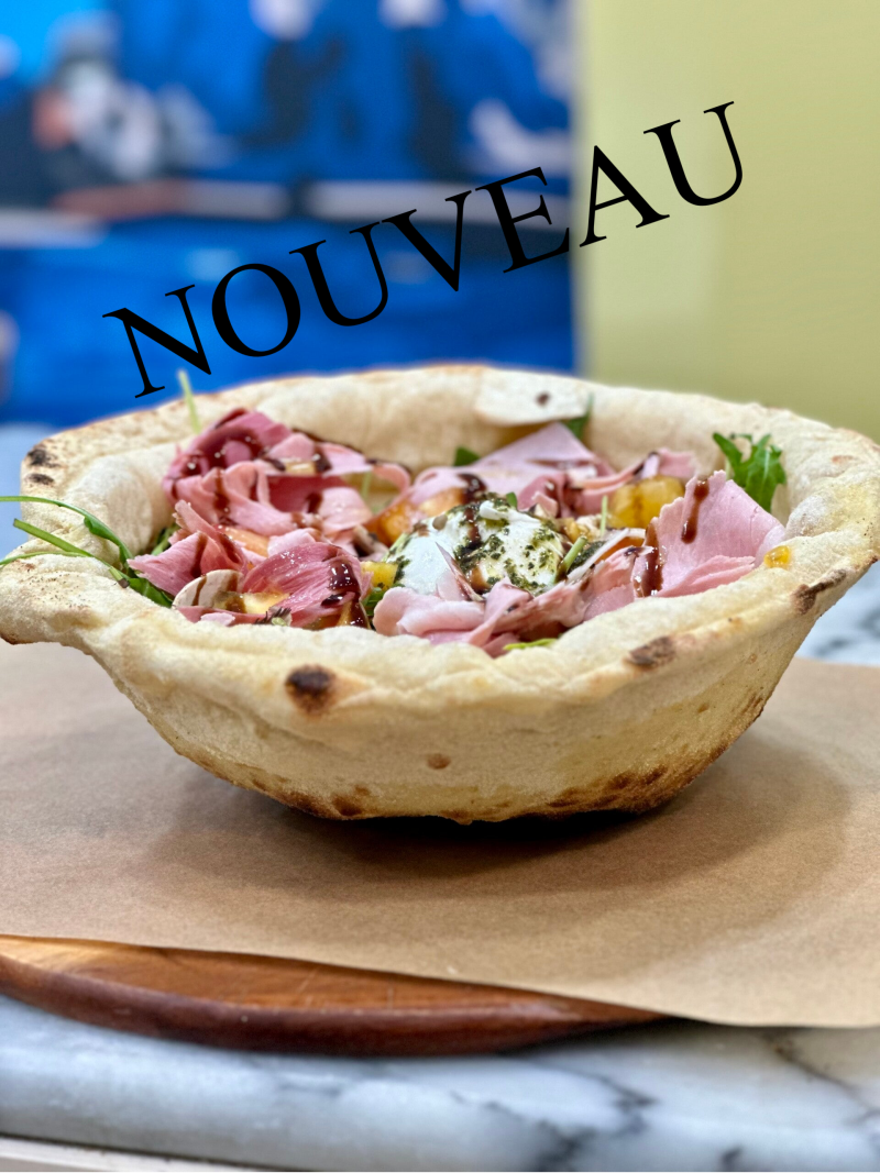 Tomate, Mozzarella FDL, Coppa grillée, Roquette, Parmesan, Tomates confites, huile basilic