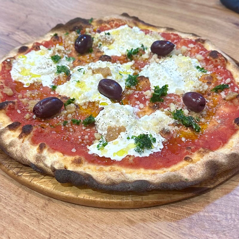 Pizza romaine bordure très fine et croustillante . Base tomate, stracciatella, parmesan, purée d’ail fumé, huile d’olive grecque avec ses olives de kalamata, une touche de persil et poivre noir de Madagascar